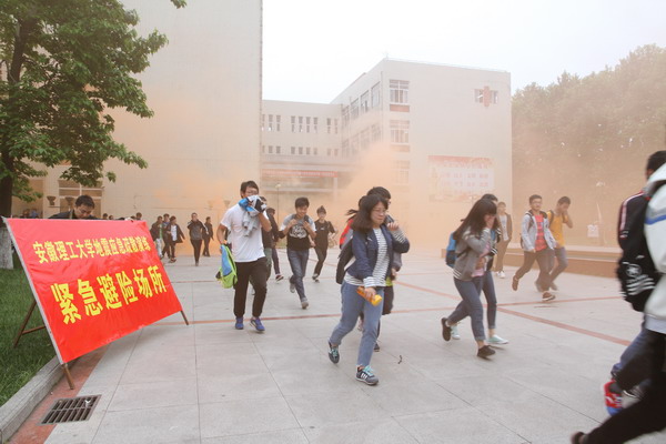 5月9日下午,北校区1、2号教学楼前广场,彩色烟雾笼罩,警报声鸣响,学子们迅速从教室跑出并向广场集合。这是学校2016年地震应急疏散演练的场面。